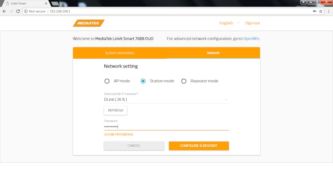 After you login go to network tab and select Station mode ( we need it(linkit smart 7688 duo) to access the internet) and connect it to your Wifi network and press Configure and restart.