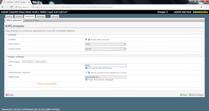 After you login go to service tab and check enable MJPG streamer and assign a port number for this service. I have assigned 4440. Click save and apply.