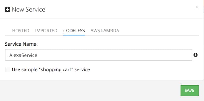 - Click the “+” icon to create a new service. Make sure to select CODELESS in the “New Service” popup. Enter “AlexaService”for the service name. Click the SAVE button: