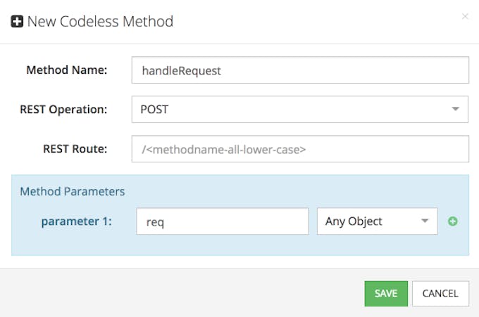 - Backendless creates the API Service and will prompt you to create a method for the service. This will be the method which will process requests from Alexa. Enter “handleRequest” for the method name. Make sure to select POST for the REST operation, and declare an argument with the name of “req” and type “Any Object” as shown below: