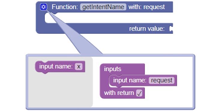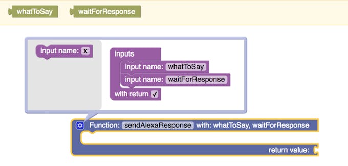 Click the gear icon located in the purple block right next to the word “Function”. Add two arguments by dragging the input blocks as shown in the image below. Assign the names of the arguments as “whatToSay” and “waitForResponse“. Notice that as you add arguments, the Context Blocks area is automatically populated with the blocks representing argument values: