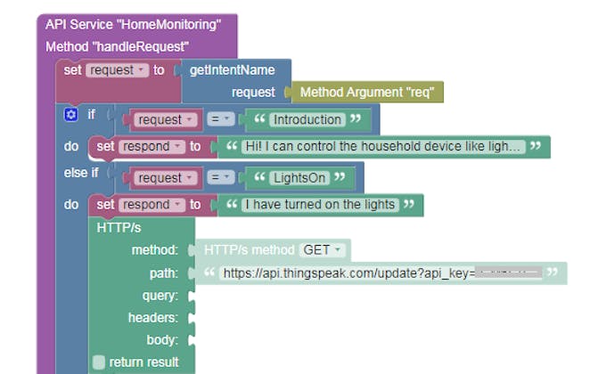 if the request is LightsOn intent then we update the thingspeak channel to '0' using http get request and at the same time we update the device status( 1/0 depending on On/Off). Same thing is repeated of LightsOff, FanOn and FanOff.