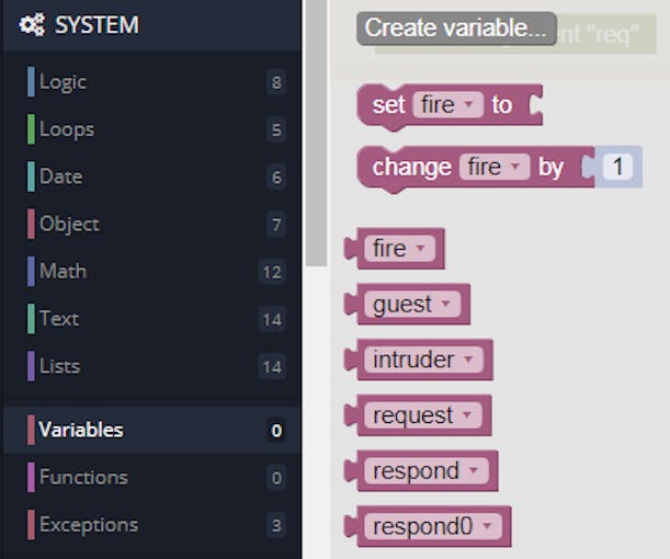this will get the intent name based on sample utterances. Go back to api services-><app name>-->handle request in the browser section. Variables and logic is create from system section. Create the following variables: