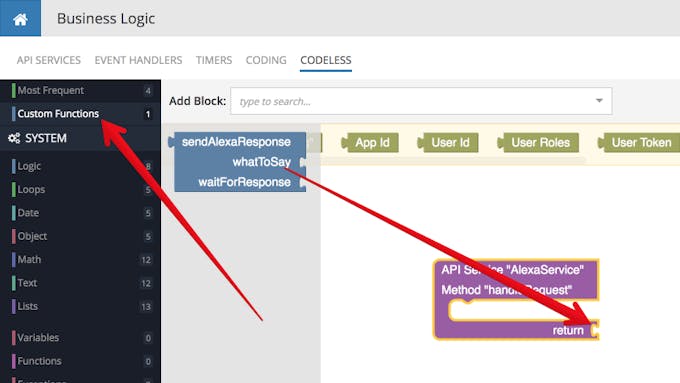 Now that the custom function is built, switch back to the handleRequest method of the AlexaService service. Click the Custom Functions category in the toolbar on the left and drag the sendAlexaResponse block to connect with the return connector of your service method: